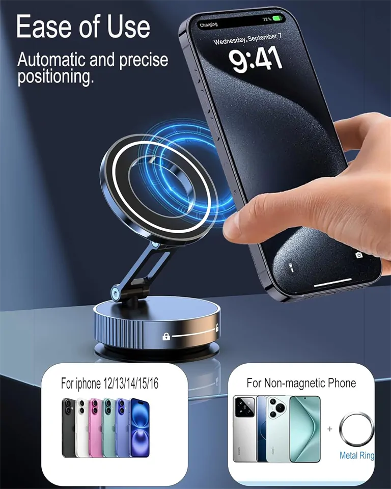 - MagSafe & univerzális kompatibilitás: iPhone 12+ modellekhez natívan, Androidokhoz a 2 fémgyűrűvel – igazi univerzális telefontartó, ami minden okostelefont kezeli.