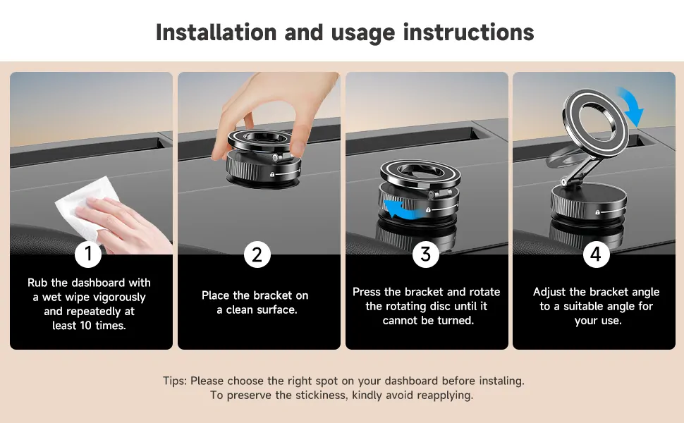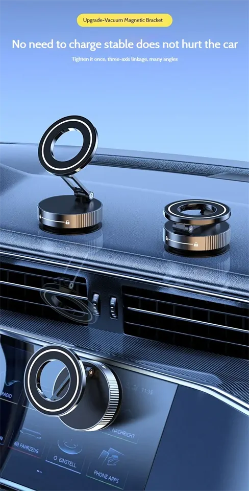 A használat egyszerű: tisztítsd meg a felületet a mellékelt készlettel, helyezd rá a tartót, csavard meg a zárókart a vákuumhoz – kész! Állítsd be a két csuklós kart és a 360°-os fejet a tökéletes szöghöz, majd pattintsd rá a telefont a magsafe telefontartó mágnesére. Egykezes művelet, másodpercek alatt stabil, akár autóban, konyhában vagy edzésen. Bármilyen sima helyre (üveg, csempe, műszerfal) rögzíthető, texturálthoz pedig a plusz lapot használd.